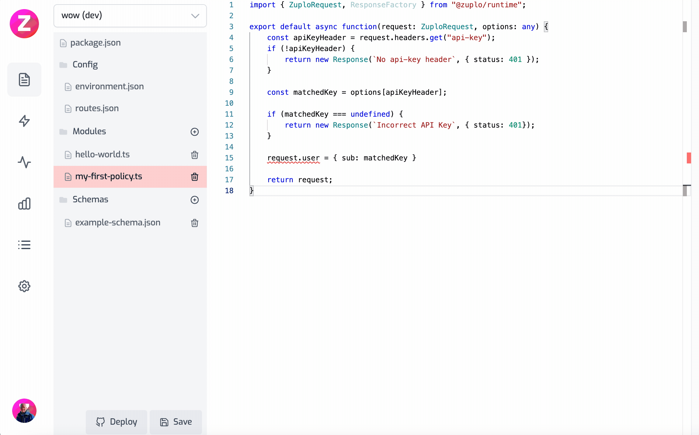 A common use case for policies is authentication. In the following example we'll create a simple auth policy that checks for an api-key header: